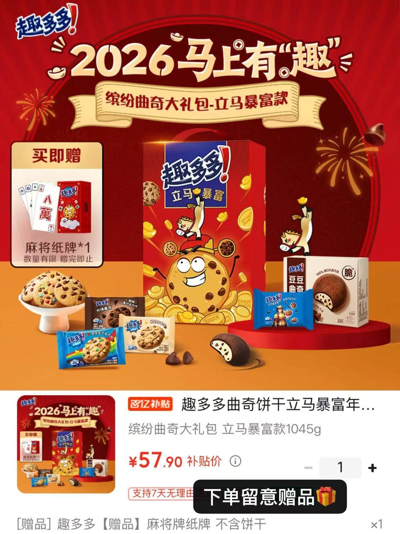 年货好礼提前备 趣多多 立马暴富曲奇饼干1045g 57.9亓自营包邮,plus55亓好单发报员2026年01月14日 12:000举报 ——年货好礼提前备——趣多多 立马暴富曲奇饼干1045ghttps://u.jd.com/EgywlWL57.9亓自营包邮,plus55亓*赠麻将纸牌1副 送礼待客必备复制文案