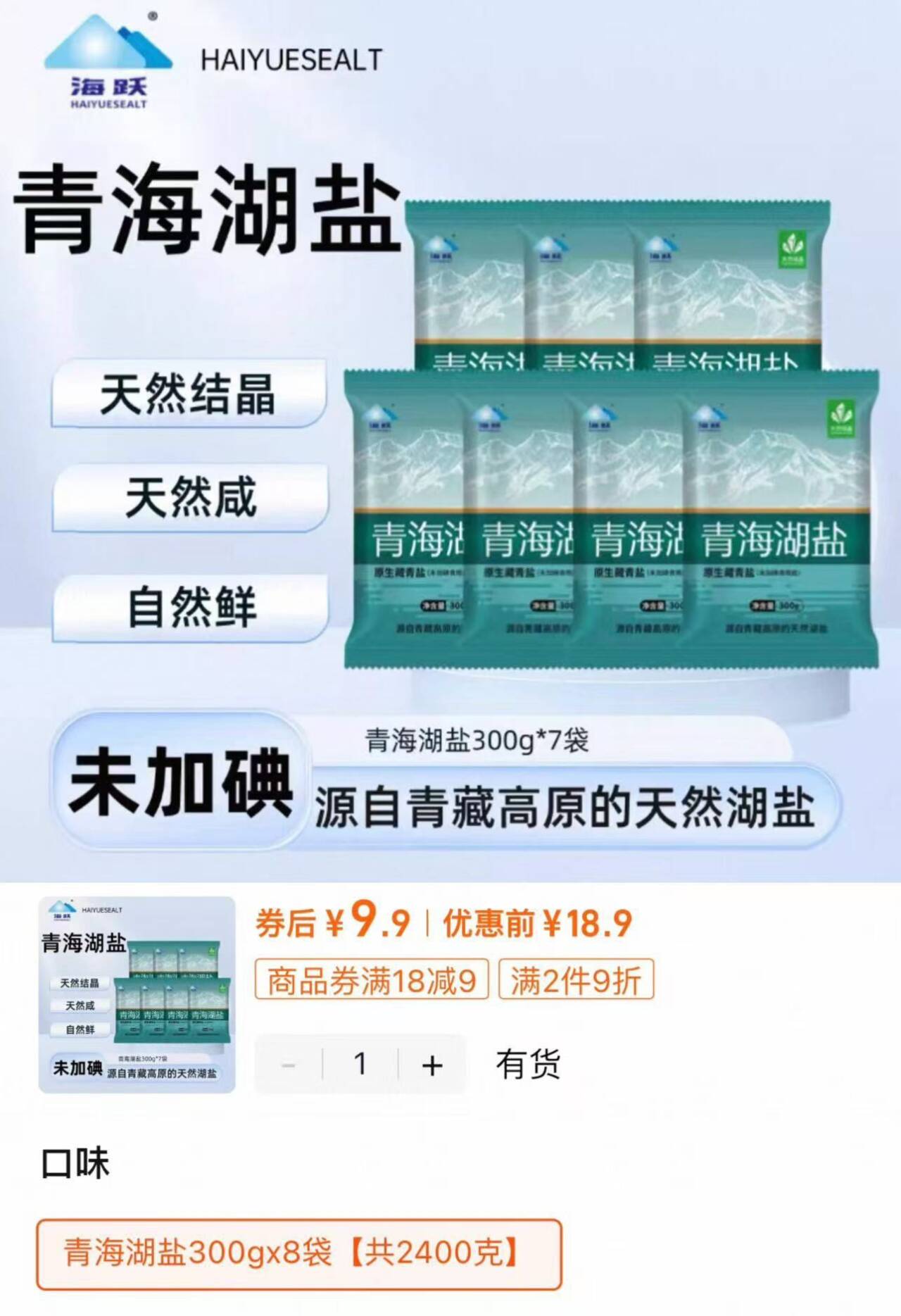 海跃未加碘青海湖盐 9元.9元300g*8袋 源自青藏高原的天然盐湖好单发报员2026年01月14日 15:330举报 海跃未加碘青海湖盐9元.9元300g*8袋源自青藏高原的天然盐湖纯天然无污染 微量元素高~-https://m.tb.cn/h.7PcwJao复制文案