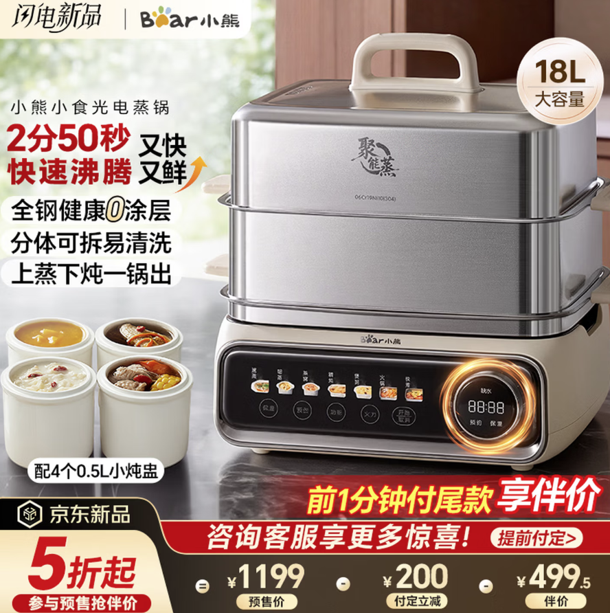 小熊(Bear)小食光电蒸锅 炖蒸煮一体自动断电不锈钢2层蒸锅家用3-4人 分体式18L大容量多功能锅
