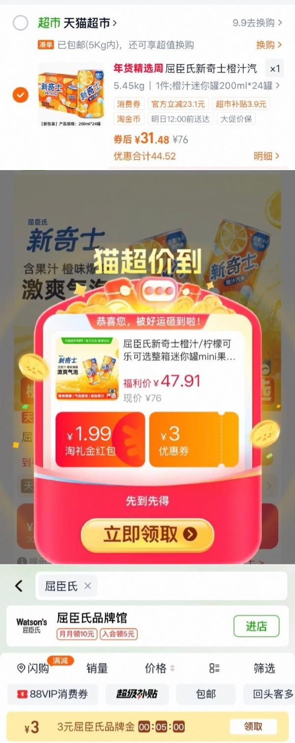 超市首页搜索“屈臣氏”,部分有3品牌金