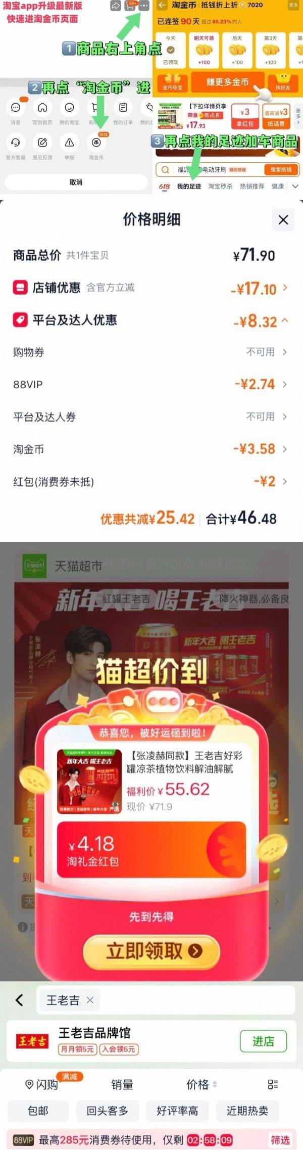 王老吉好彩罐凉茶植物饮料310ml*24罐,领礼金 超市首页搜索“王老吉”,品牌馆会员领5券 淘金币页面我的足迹加购好单发报员2026年01月25日 21:050举报 王老吉好彩罐凉茶植物饮料310ml*24罐,领礼金https://m.tb.cn/h.7peGa08超市首页搜索“王老吉”,品牌馆会员领5券淘金币页面我的足迹加购拍1件vip 金币 2福袋【42.3】 (图中价格不含礼金) 复制文案