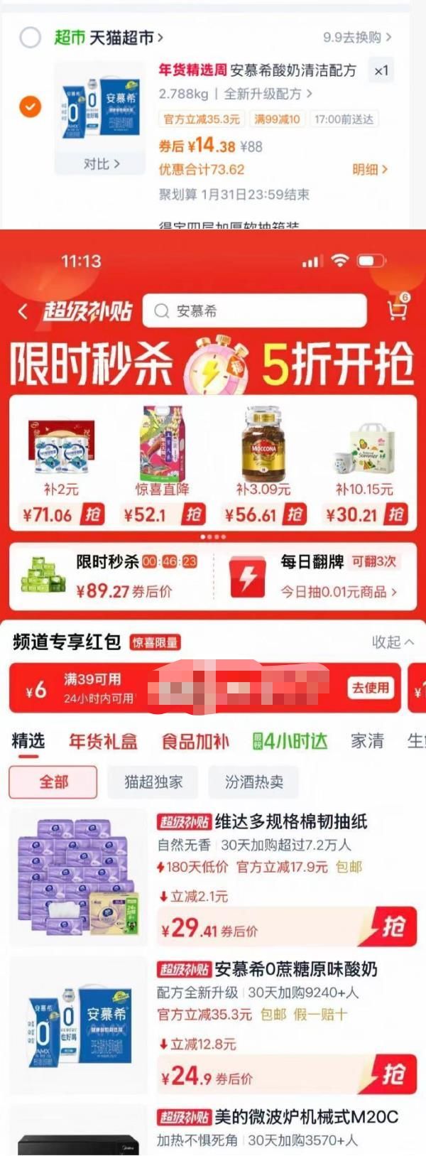 有5福袋,领5券 下拉进超级补贴领39-6并加购
