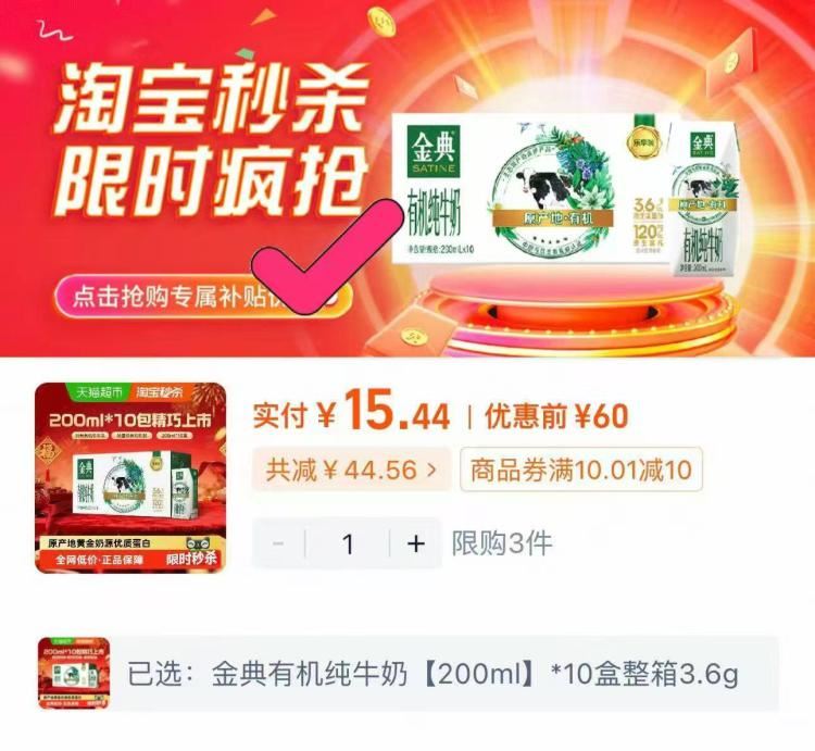 福建/安徽/浙江地区成立15元 - 金典有机纯牛奶200ml*10盒好单发报员2026年01月26日 12:010举报 福建/安徽/浙江地区成立15元-金典有机纯牛奶200ml*10盒下滑详情,到秒杀页面拍下https://m.tb.cn/h.7Kp3y24复制文案