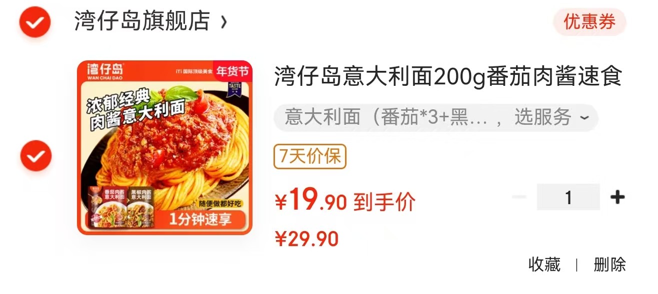 湾仔岛 意大利面200g*6包 (番茄*3 黑椒*3)【19.9】
