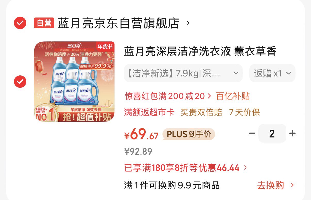 蓝月亮深层洁净洗衣液 薰衣草香 1.95kg*2瓶 1kg*4瓶