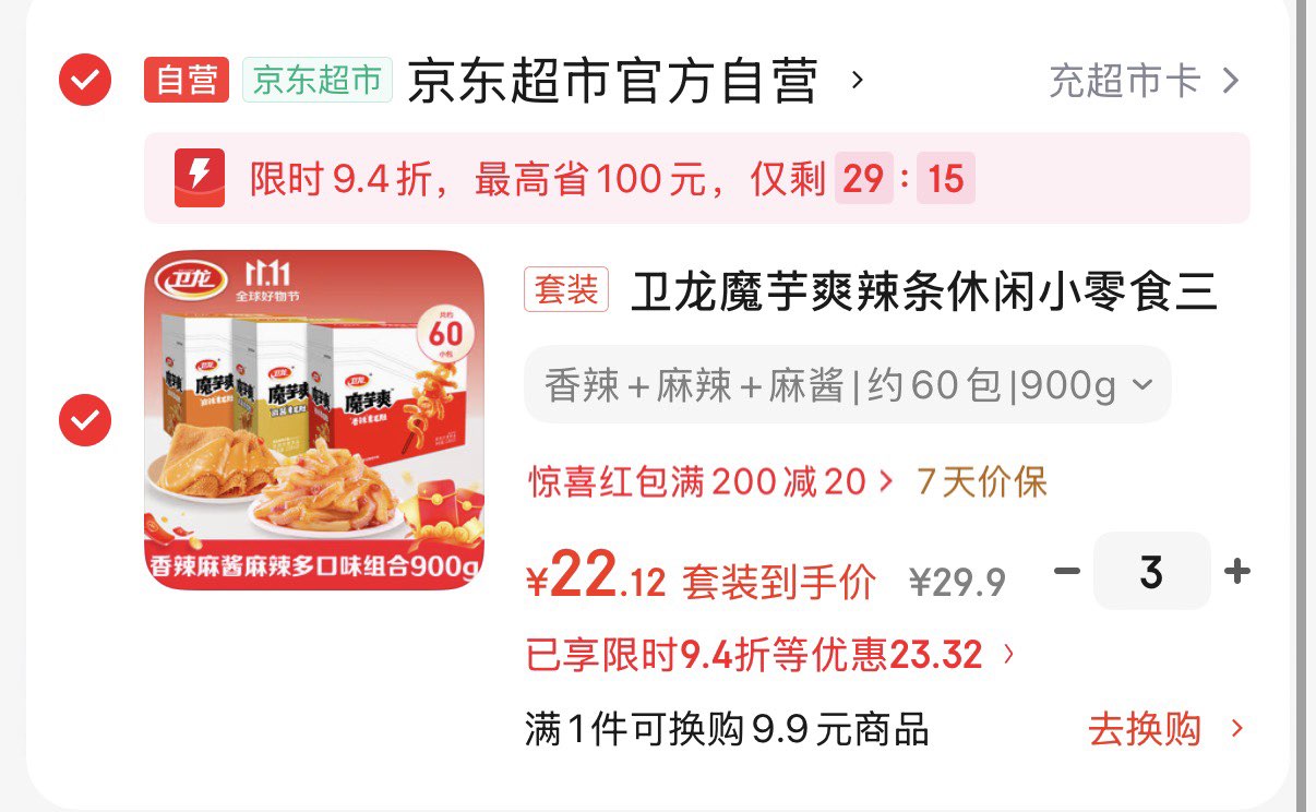 卫龙魔芋爽三盒装约60小包 浏览如弹94折限时立减 拍3件66.3亓 折22.4亓/件好单发报员2026年01月26日 20:020举报 卫龙魔芋爽三盒装约60小包浏览如弹94折限时立减拍3件66.3亓 折22.4亓/件https://u.jd.com/J1Qw1wq 复制文案