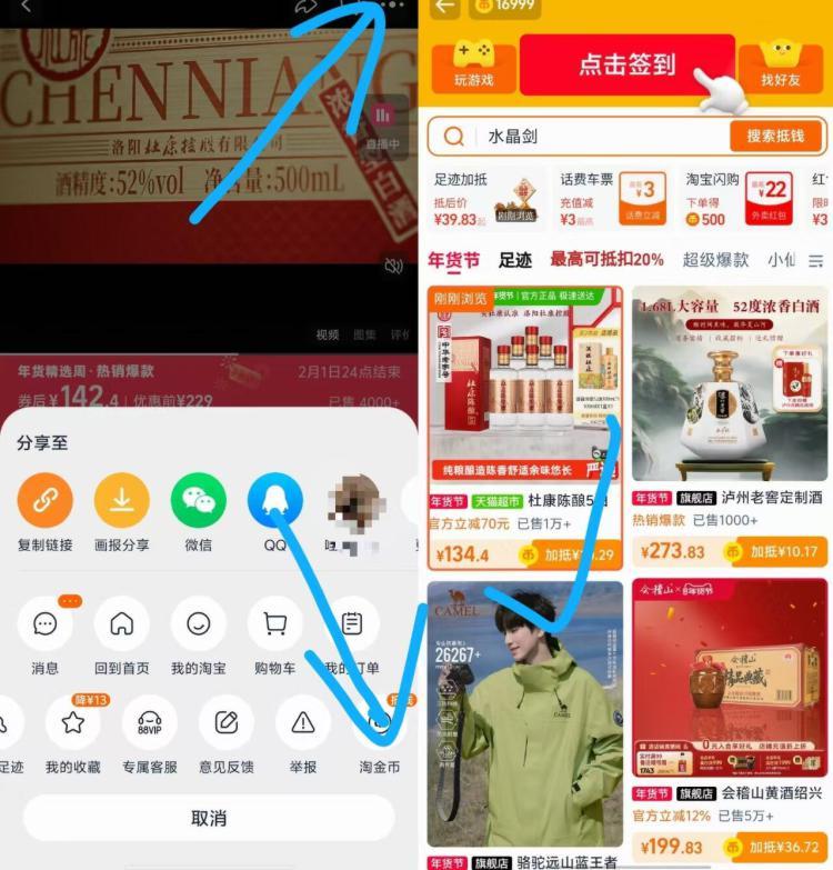 杜康陈酿白酒礼盒装134元.7 内含:52度白酒500ml*6瓶 -好单发报员2026年01月26日 20:260举报 杜康陈酿白酒礼盒装134元.7内含:52度白酒500ml*6瓶-1.商品右上3个点,选淘金币2.选 我的足迹-找到商品拍下https://m.tb.cn/h.7KAlpoA复制文案