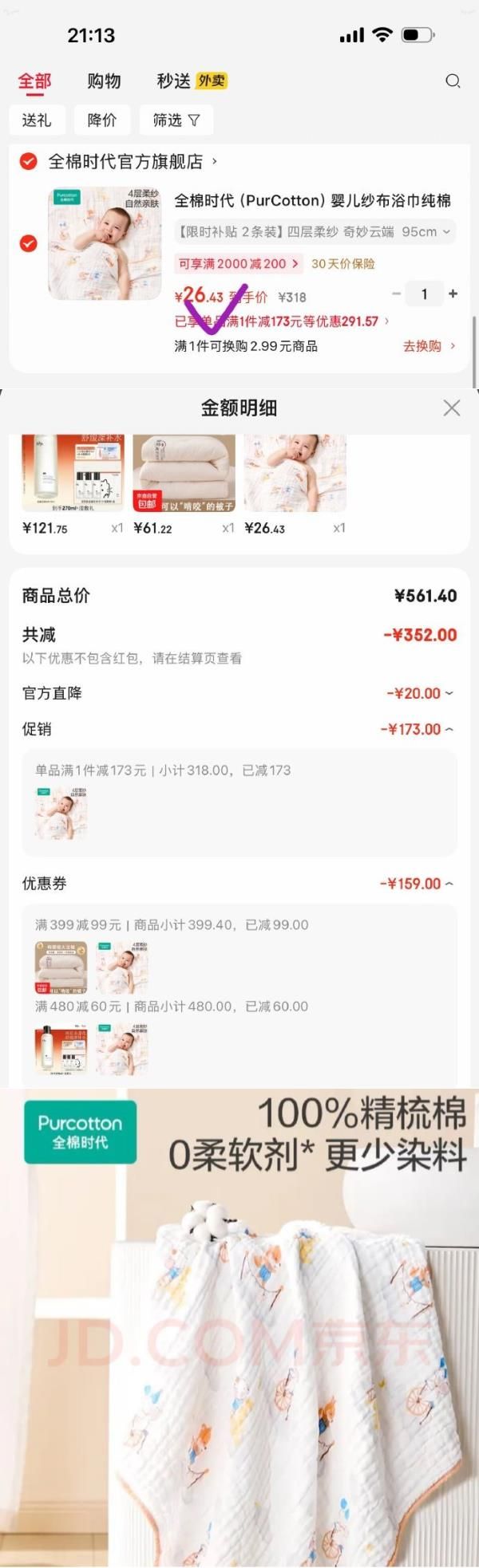 全棉时代(PurCotton)婴儿纱布浴巾纯棉2条装