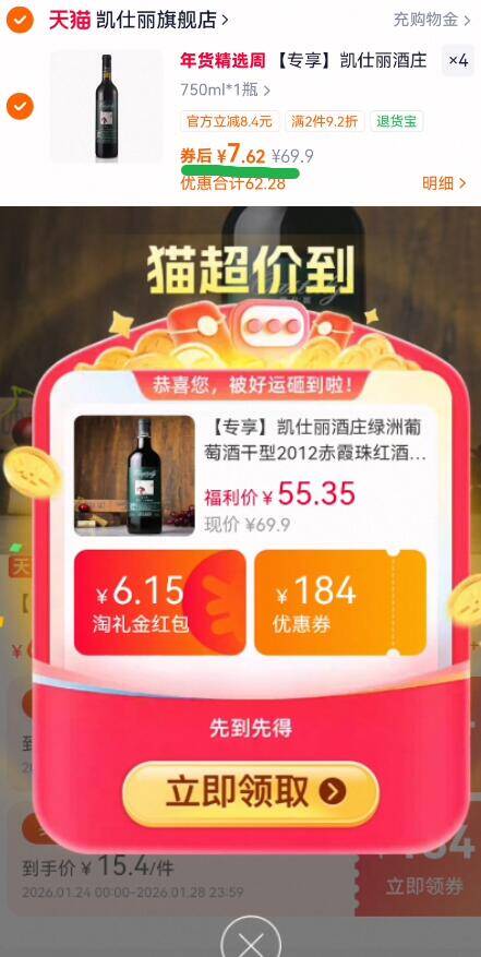 神圿快冲折7块多/瓶 直接拍4件30亓,叠限时礼金 凯仕丽 绿洲干红750ml*4瓶好单发报员2026年01月26日 21:390举报 神圿快冲折7块多/瓶直接拍4件30亓,叠限时礼金【凯仕丽】绿洲干红750ml*4瓶https://m.tb.cn/h.7pdq5k3复制文案