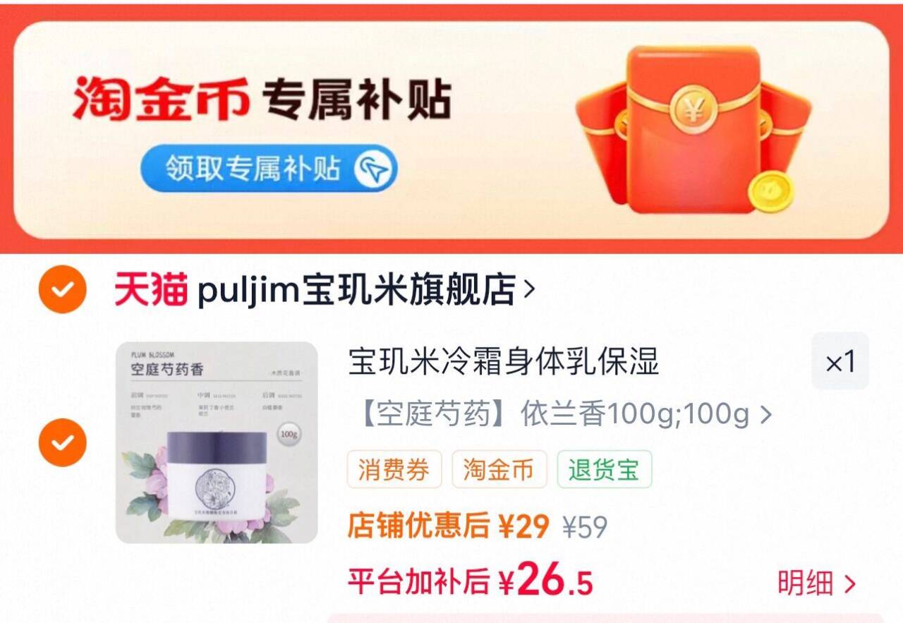 下拉详情拍,26.5亓 宝玑米.身体冷霜身体乳100g好单发报员2026年01月26日 23:520举报 下拉详情拍,26.5亓宝玑米.身体冷霜身体乳100ghttps://m.tb.cn/h.7pHkPP8复制文案