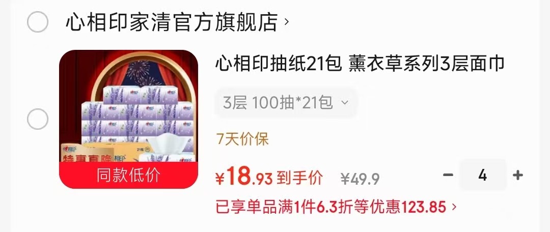 心相印 薰衣草系列3层 100抽*21包,拍4件【75.7】