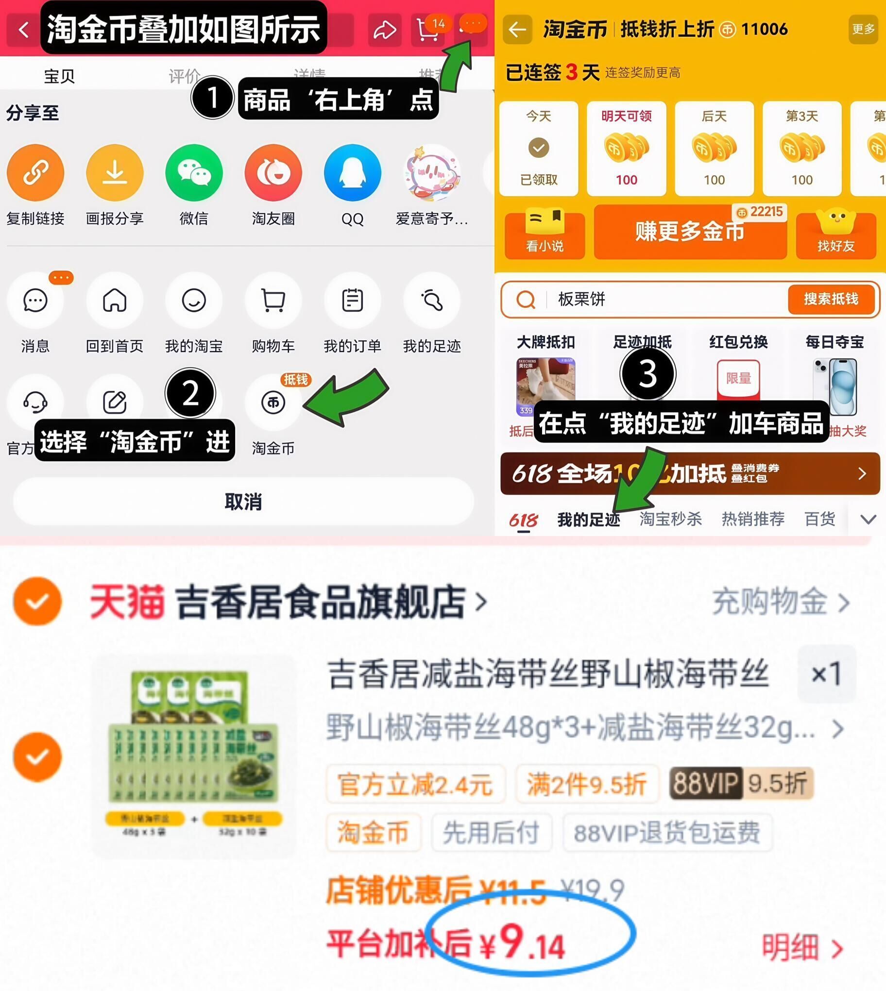 88vip6毛/包速拍下9亓 吉香居 野山椒海带丝13袋 1、如图点右上角3个点,选淘金币好单发报员2026年02月03日 13:490举报 88vip6毛/包速拍下9亓【吉香居】野山椒海带丝13袋1、如图点右上角3个点,选淘金币2、选我的足迹-找到商品拍下https://m.tb.cn/h.7HRBfab复制文案