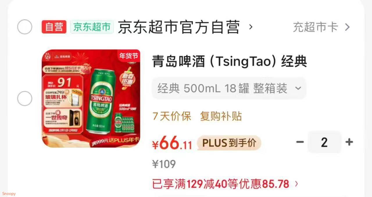 青岛啤酒(TsingTao)经典 500ml*18听整箱装,拍2件 折66/件