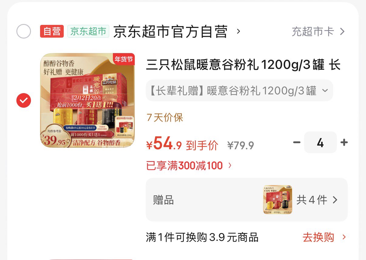 如有300-100券 18点补 三只松鼠暖意谷粉礼1200g/3罐 拍4件到手219.6亓好单发报员2026年02月03日 15:400举报 如有300-100券(18点补)https://u.jd.com/J1fvvzB 三只松鼠暖意谷粉礼1200g/3罐拍4件到手219.6亓 前1000份买1赠1 折27.4/箱https://u.jd.com/J6f8LLd 复制文案