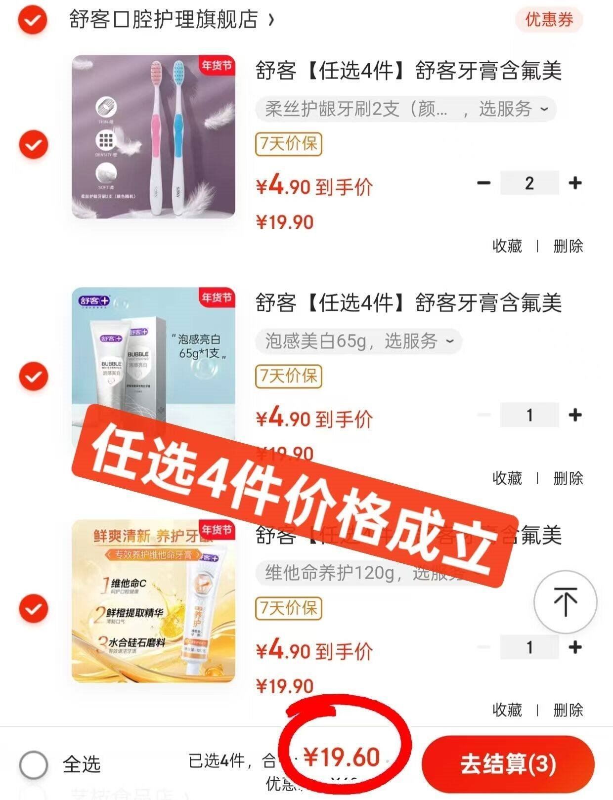 舒客个护任选車 舒客 牙膏/牙刷/儿童牙膏任选 任选4件19.6亓,折4.9亓/件好单发报员2026年02月03日 16:060举报 ——舒客个护任选車——舒客 牙膏/牙刷/儿童牙膏任选https://u.jd.com/JOfW07M 任选4件19.6亓,折4.9亓/件*都是正装 真的太值咯 挑一挑复制文案