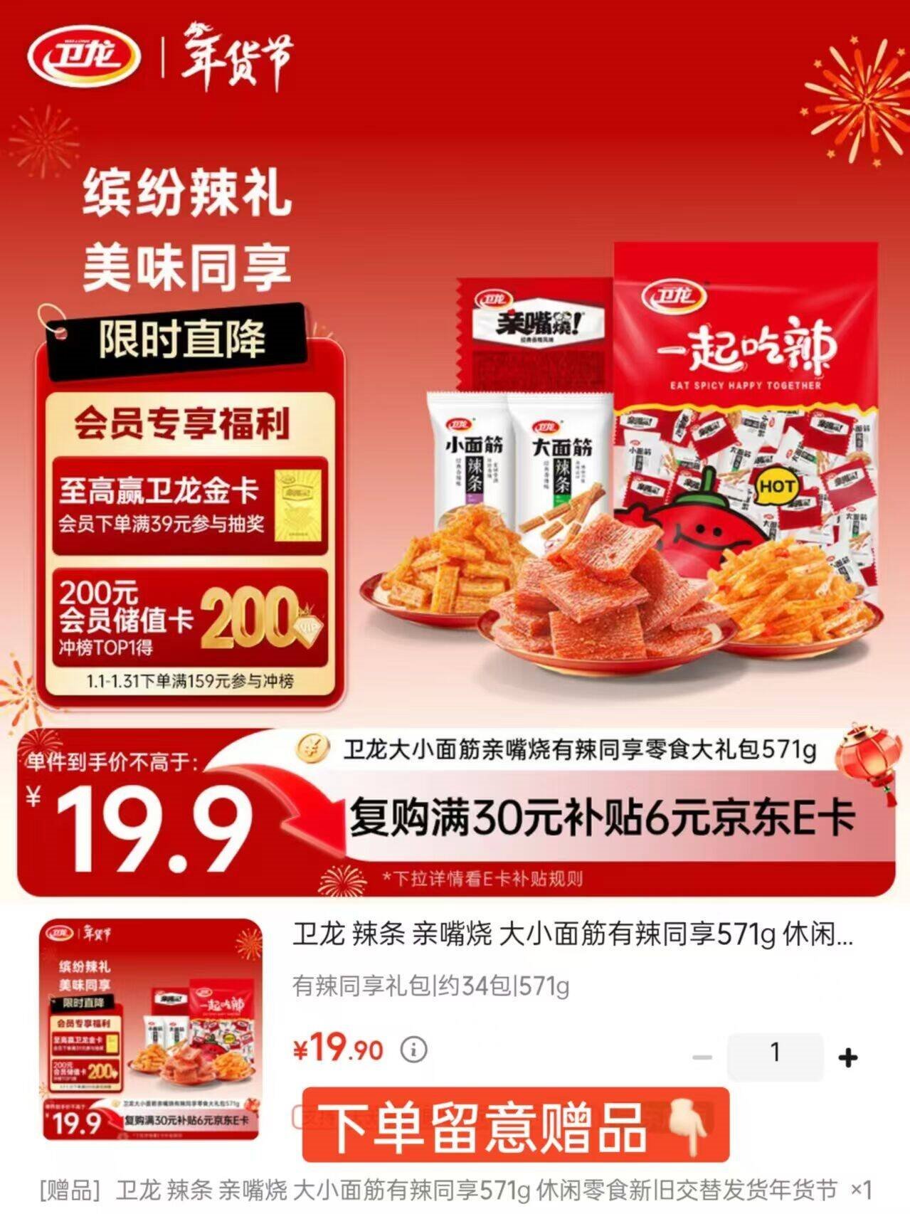 卫龙辣条买1送1 自营 卫龙 有辣同享辣条571g 19.9亓 云费,Plus无限包邮好单发报员2026年02月03日 19:040举报 ——卫龙辣条买1送1——【自营】卫龙 有辣同享辣条571ghttps://u.jd.com/J1Hixhq19.9亓 云费,Plus无限包邮*赠同款辣条571g 才9.9亓/件*大小面筋 亲嘴烧 独立小包装复制文案