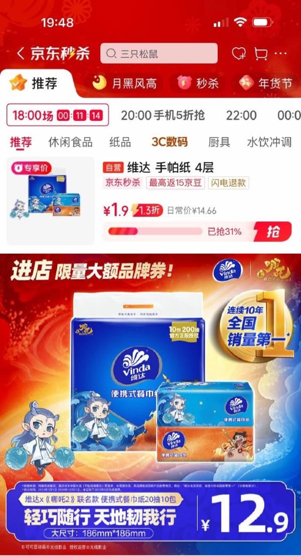 维达x哪吒2联名款手帕纸4层20抽10包