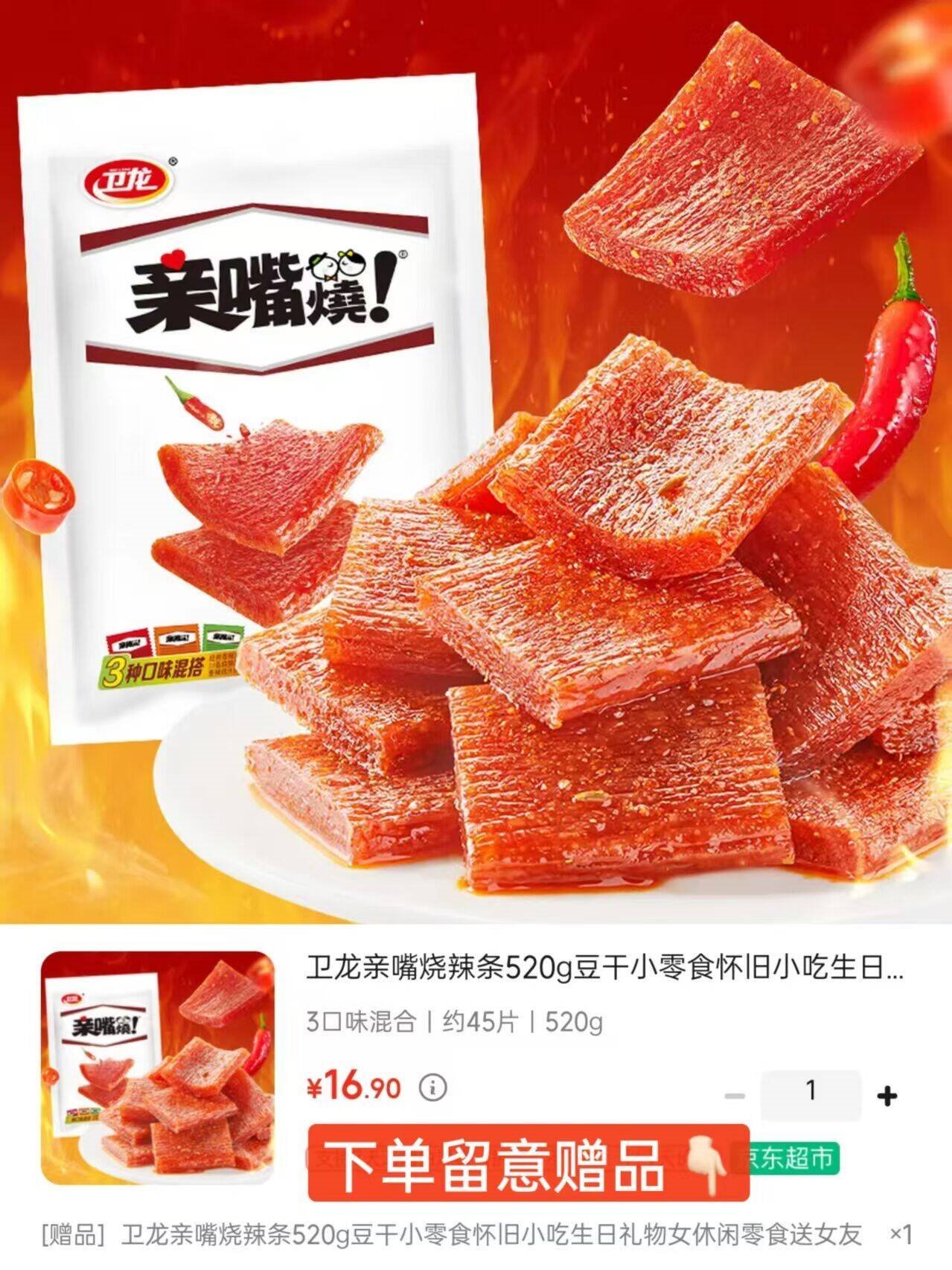 快卫龙买1送1 自营 卫龙 亲嘴烧辣条520g 16.9亓 云费,Plus无限包邮好单发报员2026年02月03日 20:300举报 ——快卫龙买1送1——【自营】卫龙 亲嘴烧辣条520ghttps://u.jd.com/JGHDlRn16.9亓 云费,Plus无限包邮*赠同款辣条520g 才8.4亓/件*鲜辣Q弹 解馋过瘾 爱吃必.囤复制文案