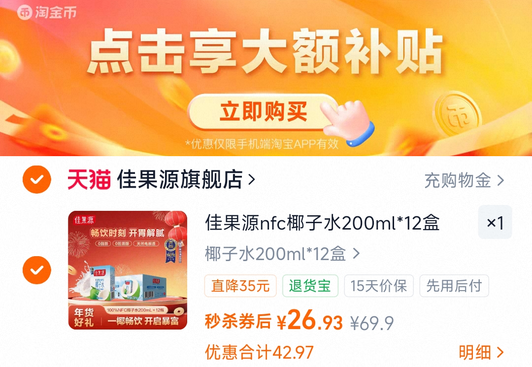 下拉详情拍,26.9亓 折2.2亓/盒 佳果源佳农100%椰子水200ml*12盒好单发报员2026年02月28日 16:110举报 下拉详情拍,26.9亓 折2.2亓/盒佳果源佳农100%椰子水200ml*12盒https://m.tb.cn/h.i0RyvHu复制文案