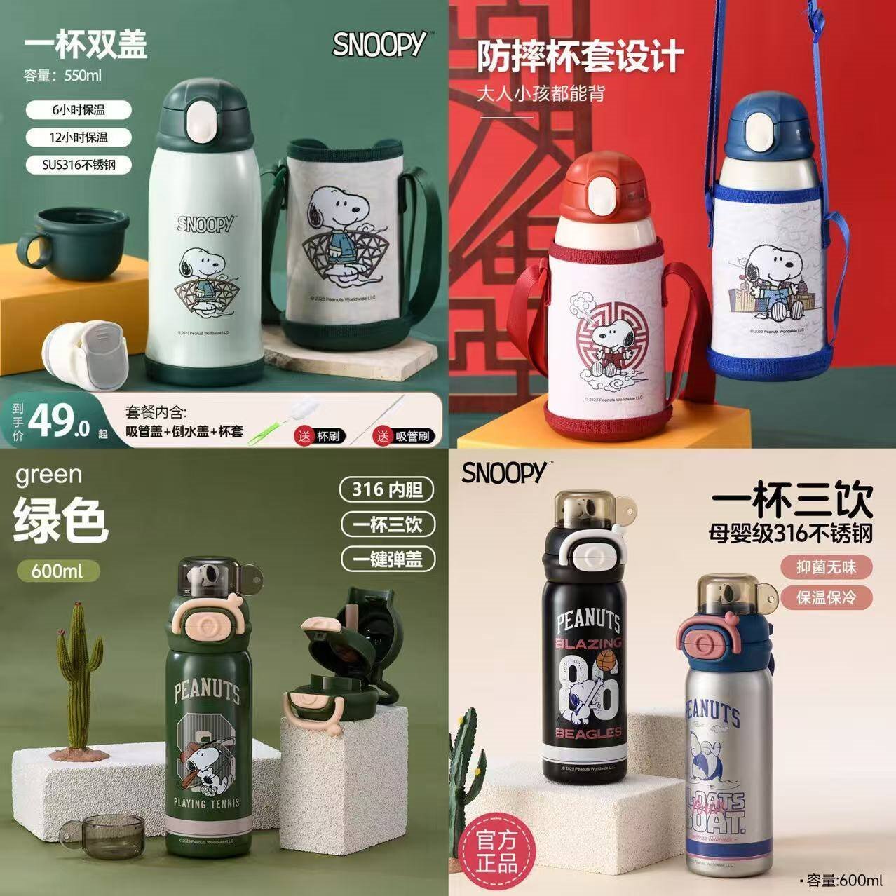 史努比 不锈钢双盖保温杯550ml