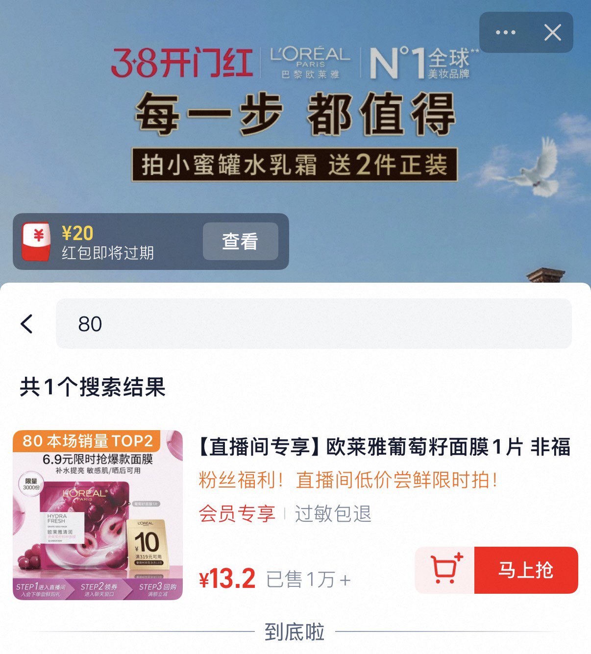 如欧莱雅ZbJ紅包还没用 面膜拍下0