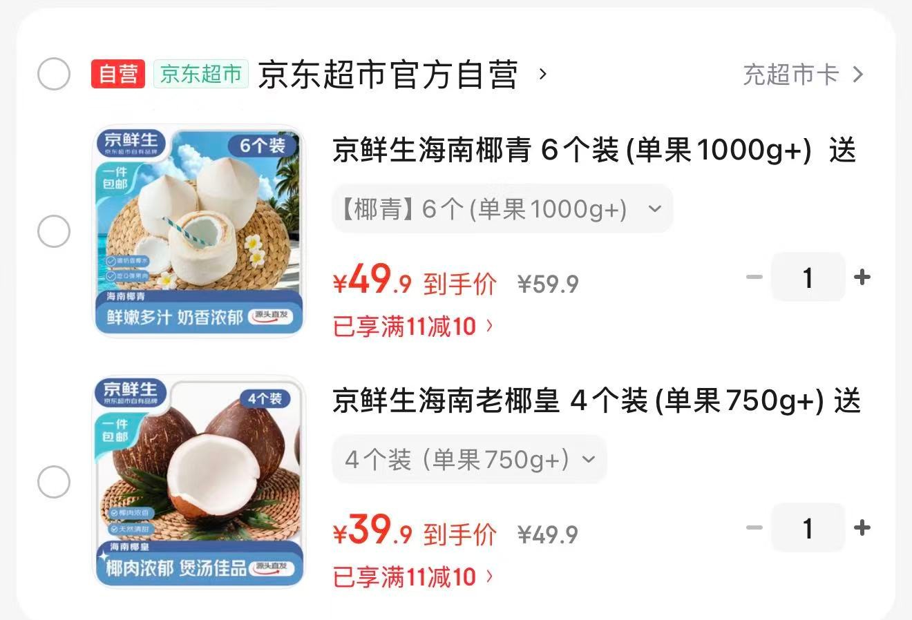 京鲜生海南椰青 6个装单果1000g 送开椰器【49.9】