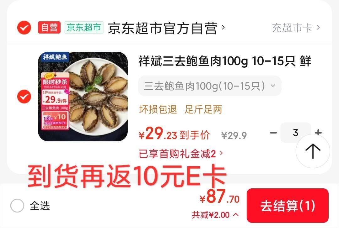 1.7元/只!自营好价鲍鱼! 自营 祥斌 三去鲍鱼肉100g 10-15只 到货返10E卡后3件77.7元好单发报员2026年03月11日 21:350举报 1.7元/只!自营好价鲍鱼!【自营】祥斌 三去鲍鱼肉100g 10-15只https://u.jd.com/N60cppa到货返10E卡后3件77.7元复制文案