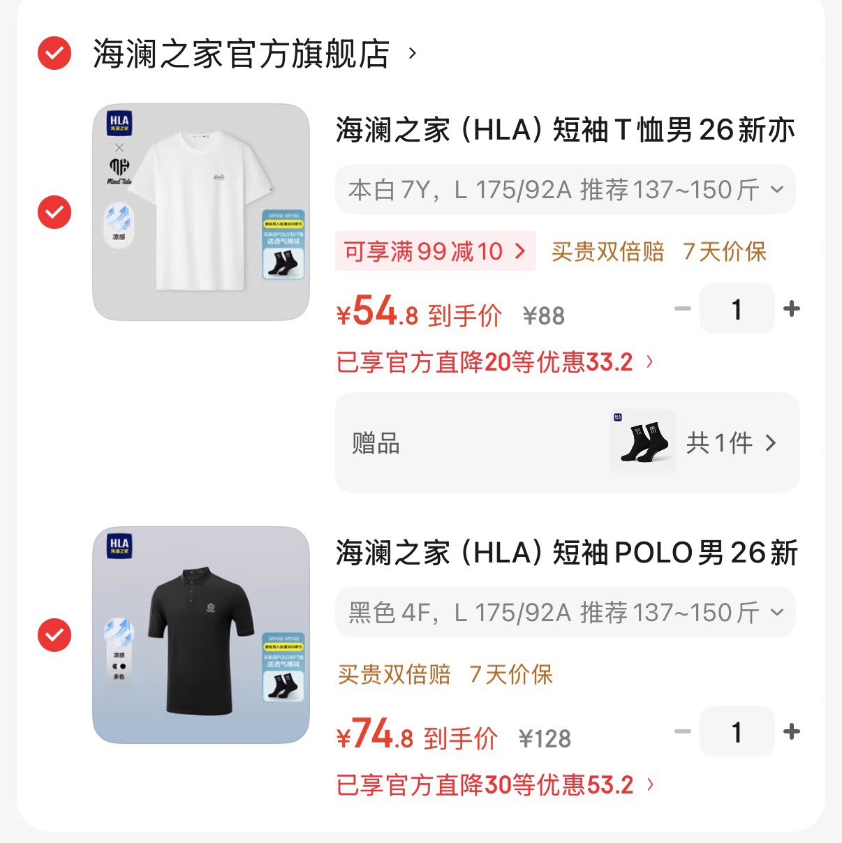 海澜之家各拍1件129.6亓