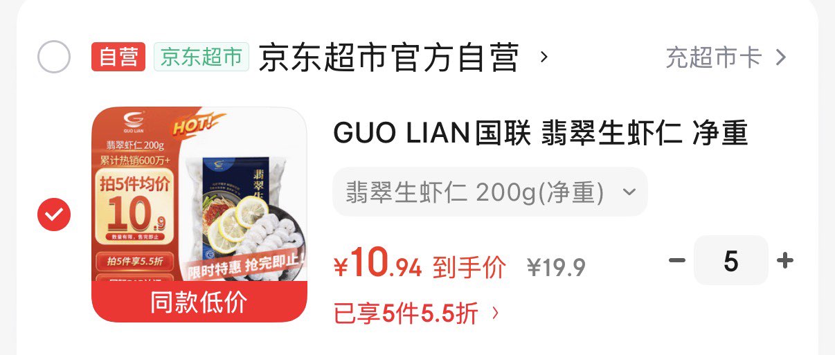 国联 翡翠生虾仁 净重200g 拍5件54.7亓 折10.9亓/袋好单发报员2026年03月12日 10:020举报 国联 翡翠生虾仁 净重200g拍5件54.7亓 折10.9亓/袋https://u.jd.com/NOp8E3P复制文案