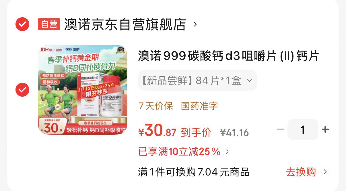 澳诺碳酸钙d3咀嚼片84片 拍下30.9亓 可多拍好单发报员2026年03月13日 16:200举报 澳诺碳酸钙d3咀嚼片84片拍下30.9亓 可多拍https://u.jd.com/NOEiBKF复制文案