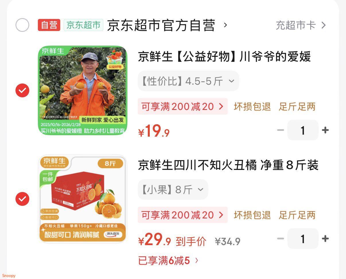京鲜生四川不知火丑橘 拍下29.9亓 净重8斤装 京鲜生爱媛38号果冻橙好单发报员2026年03月14日 11:180举报 京鲜生四川不知火丑橘拍下29.9亓 净重8斤装https://u.jd.com/Nal6cZG京鲜生爱媛38号果冻橙拍下19.9亓 净重4.5-5斤https://u.jd.com/NDl1iWv如有200-20黑五券凑后更低复制文案