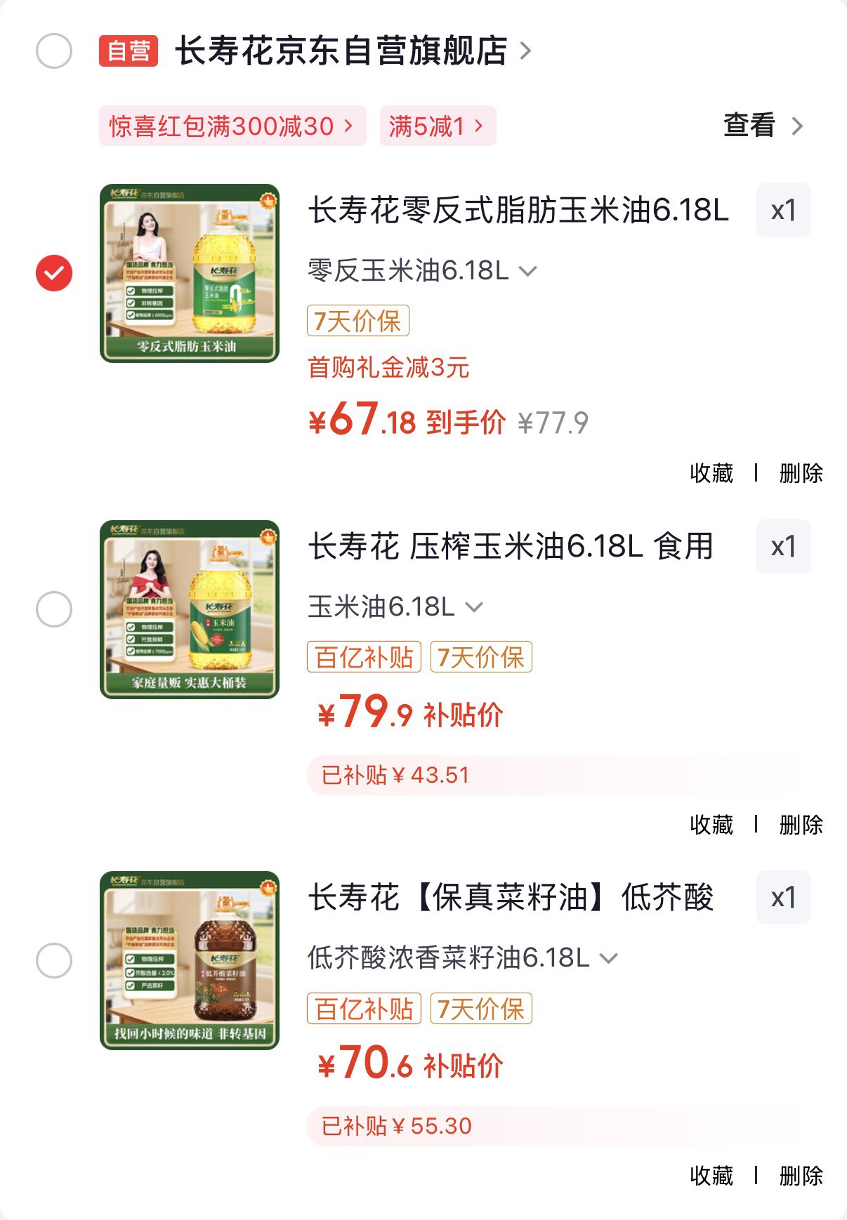 长寿花 压榨玉米油6.18L 79.9元