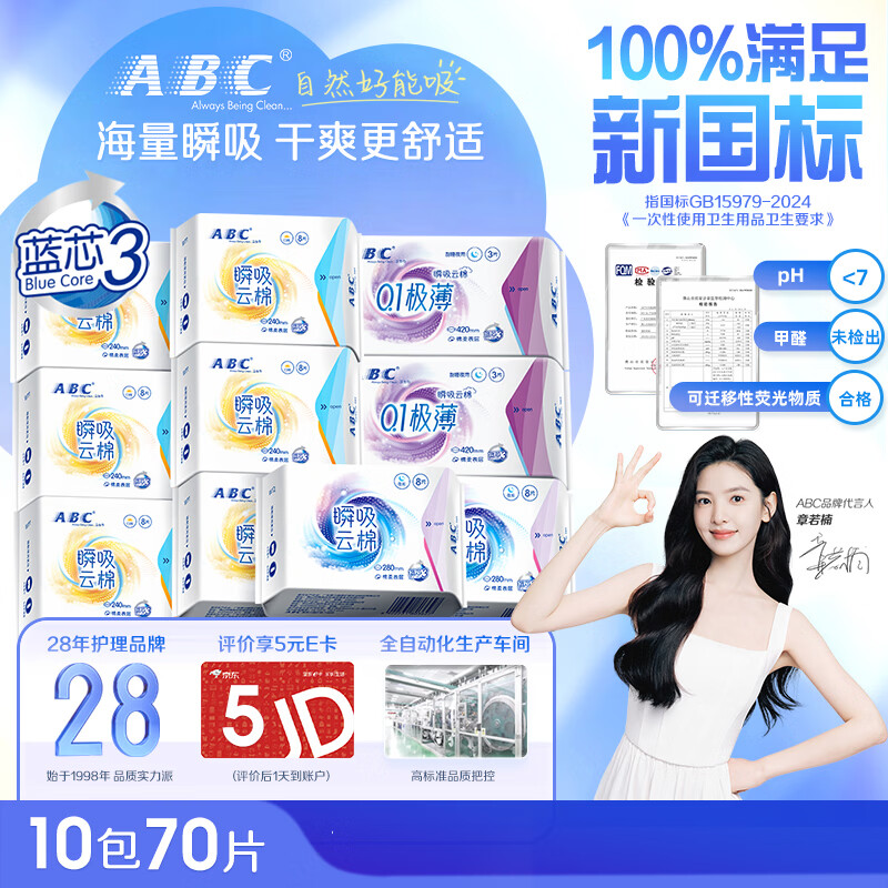 自营 ABC 章若楠代言 卫生巾 35.24元 瞬吸云棉日夜组合10包70片