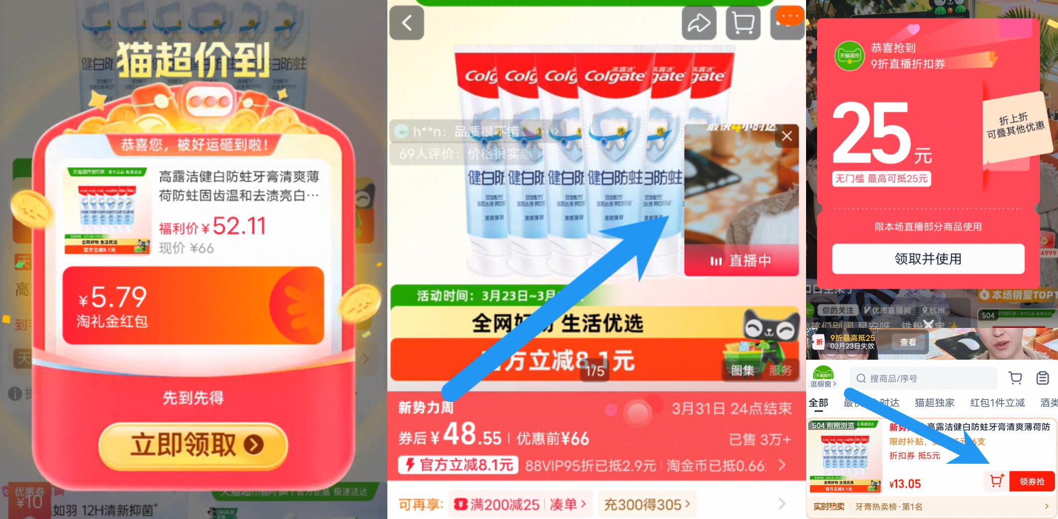 ②右上角进直播间领9折券