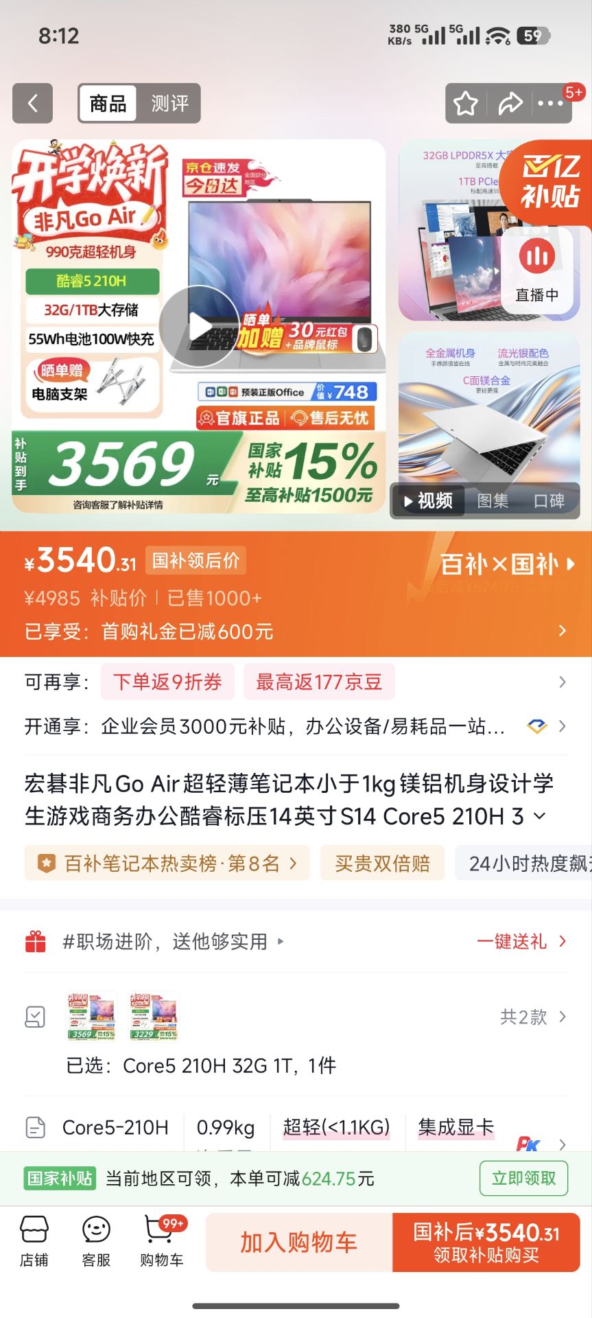 宏碁非凡Go Air超轻薄笔记本小于1kg镁铝机身S14 Core5 210H 32G 1T好单发报员2026年03月25日 09:100举报 宏碁非凡Go Air超轻薄笔记本小于1kg镁铝机身S14 Core5 210H 32G 1T【3540】国补https://u.jd.com/cG1NUbh复制文案