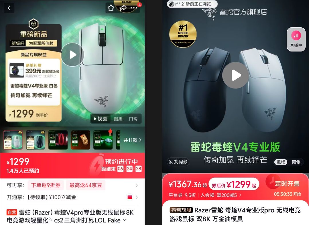 jd自营 雷蛇毒蝰v4pro 1299元