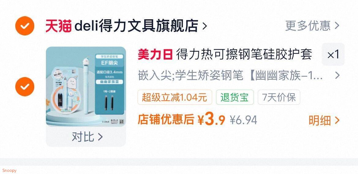 得力热可擦钢笔 2墨囊 3.9元