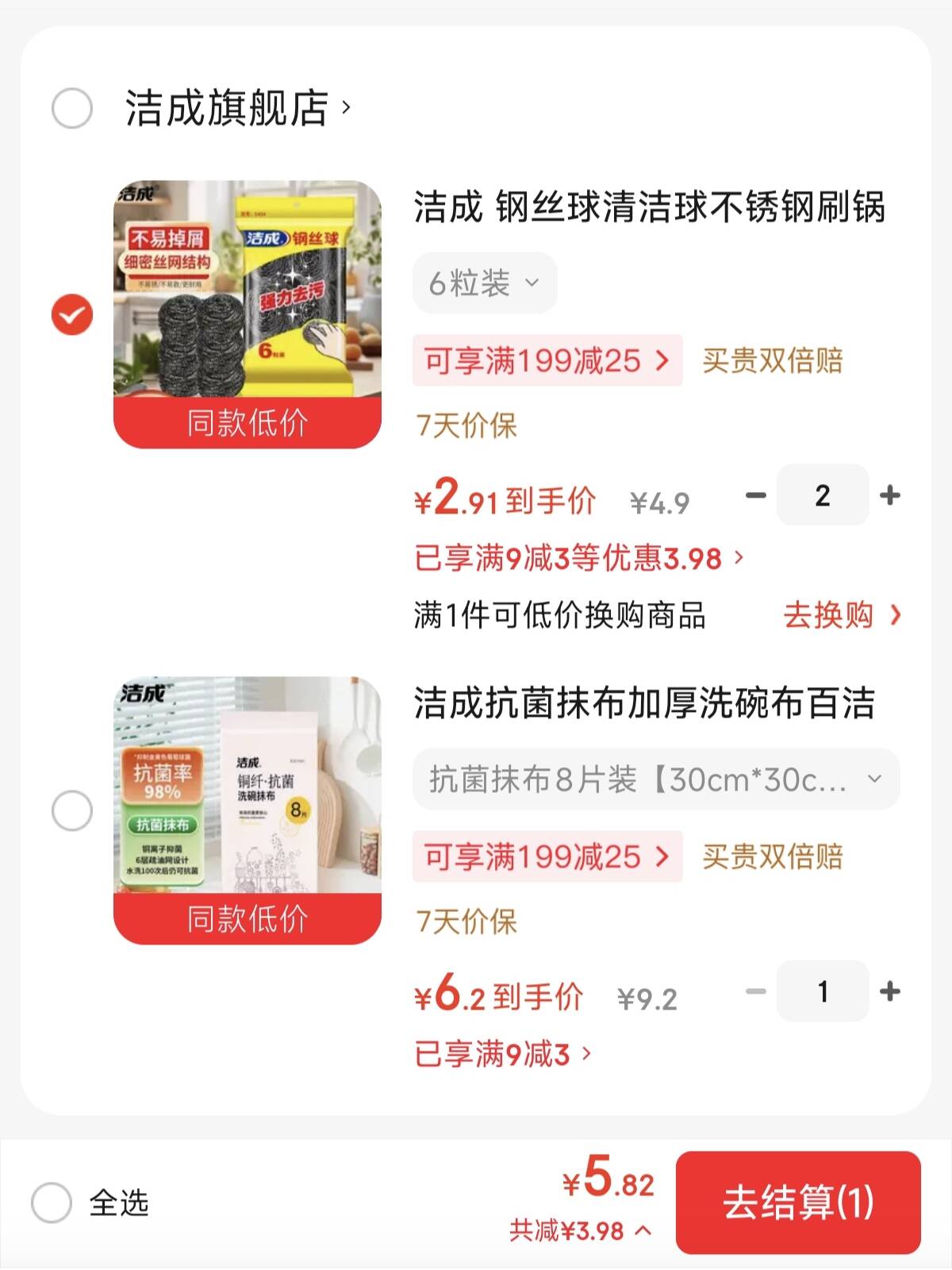 洁成 钢丝球6粒 2 件 5.8 元,洁成 抗菌百洁布8片 6.2 元