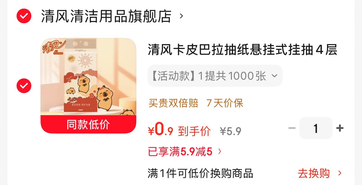 清风卡皮巴拉悬挂抽纸 0.9元