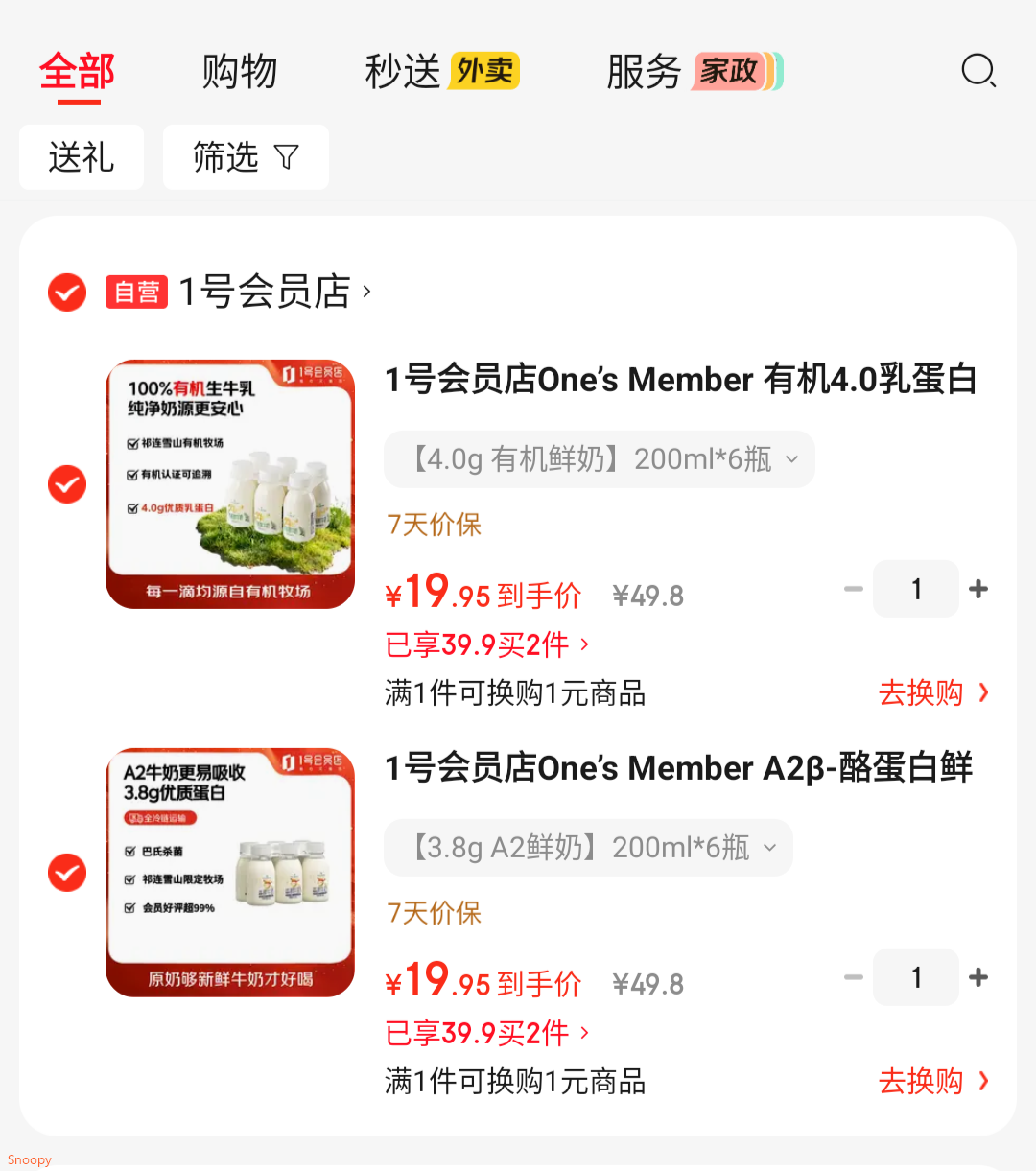 1号会员店One’s Member A2β-酪蛋白鲜牛奶小包装200ml*6 2件 39元好单发报员2026年03月27日 13:170举报 1号会员店One’s Member A2β-酪蛋白鲜牛奶小包装200ml*6,拍2件【39】https://u.jd.com/cavBrF1 有机4.0乳蛋白鲜牛奶 200ml*6瓶 这款同价,也是2件【39】https://u.jd.com/cavVjSl 复制文案