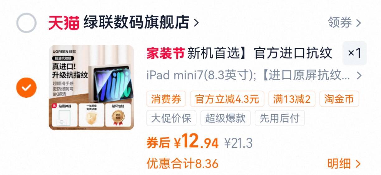 绿联苹果ipad全系钢化膜 12.9元好单发报员2026年03月27日 15:090举报 绿联苹果ipad全系钢化膜1片叠琻币拍第6选项12.9元https://m.tb.cn/h.iiH3DDG颂贴膜神器 8k高清裸机感!全系列都有!手残党闭眼入!复制文案