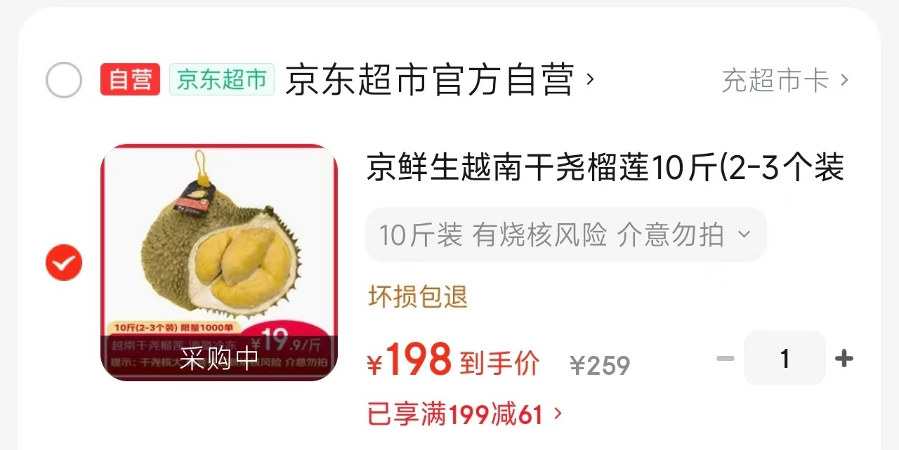 京鲜生 越南干尧榴莲10斤2-3个装液氮冷冻 保3.5房【198】