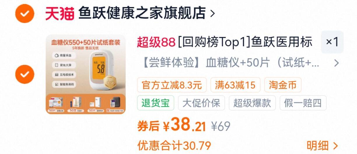 鱼跃家用血糖测试仪 赠50片试纸 采血针 酒精棉 38.2元