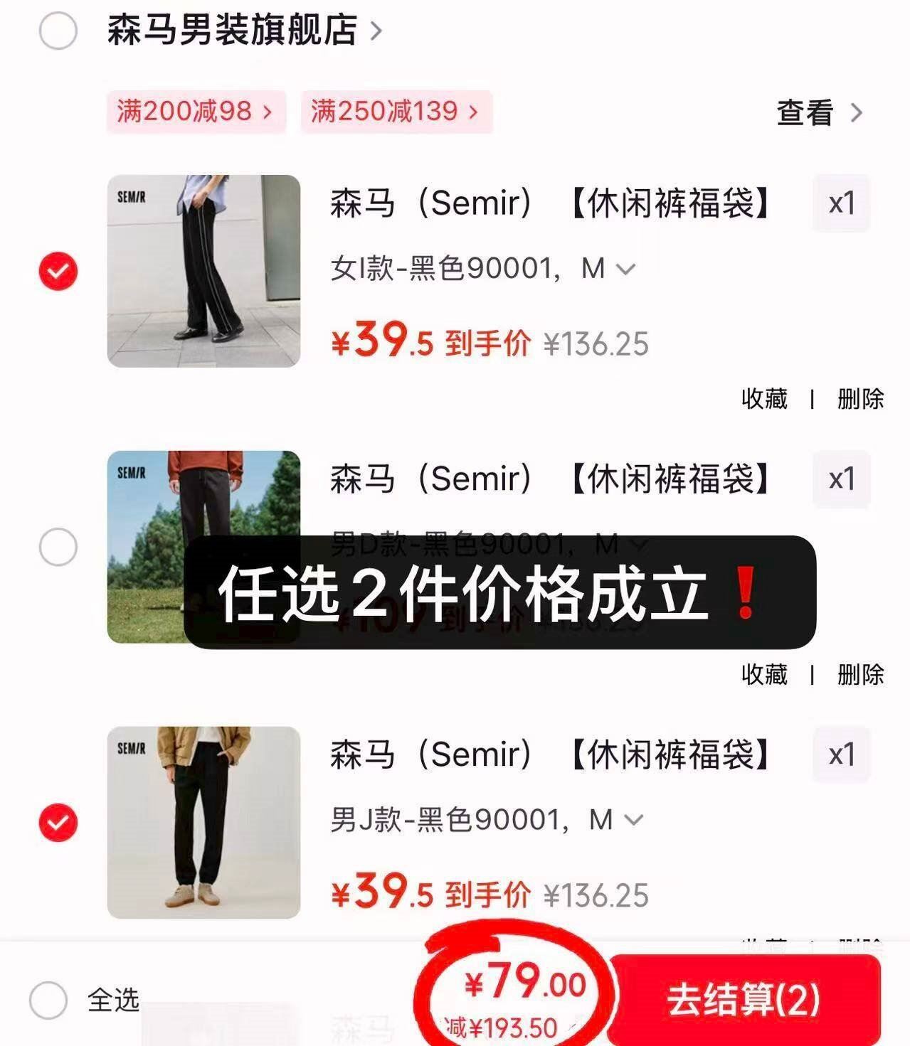 森马男女款百搭运动休闲裤任选2件 79元 发报员Z 2026年04月07日 15:22 0 举报 —— 森马断码.清仓——森马 男女歀百搭运动休闲裤https://u.jd.com/j1MK3Tb 任选2件79元,折39.5元/件*有货的抓紧 他家品质歀 挑挑 复制文案