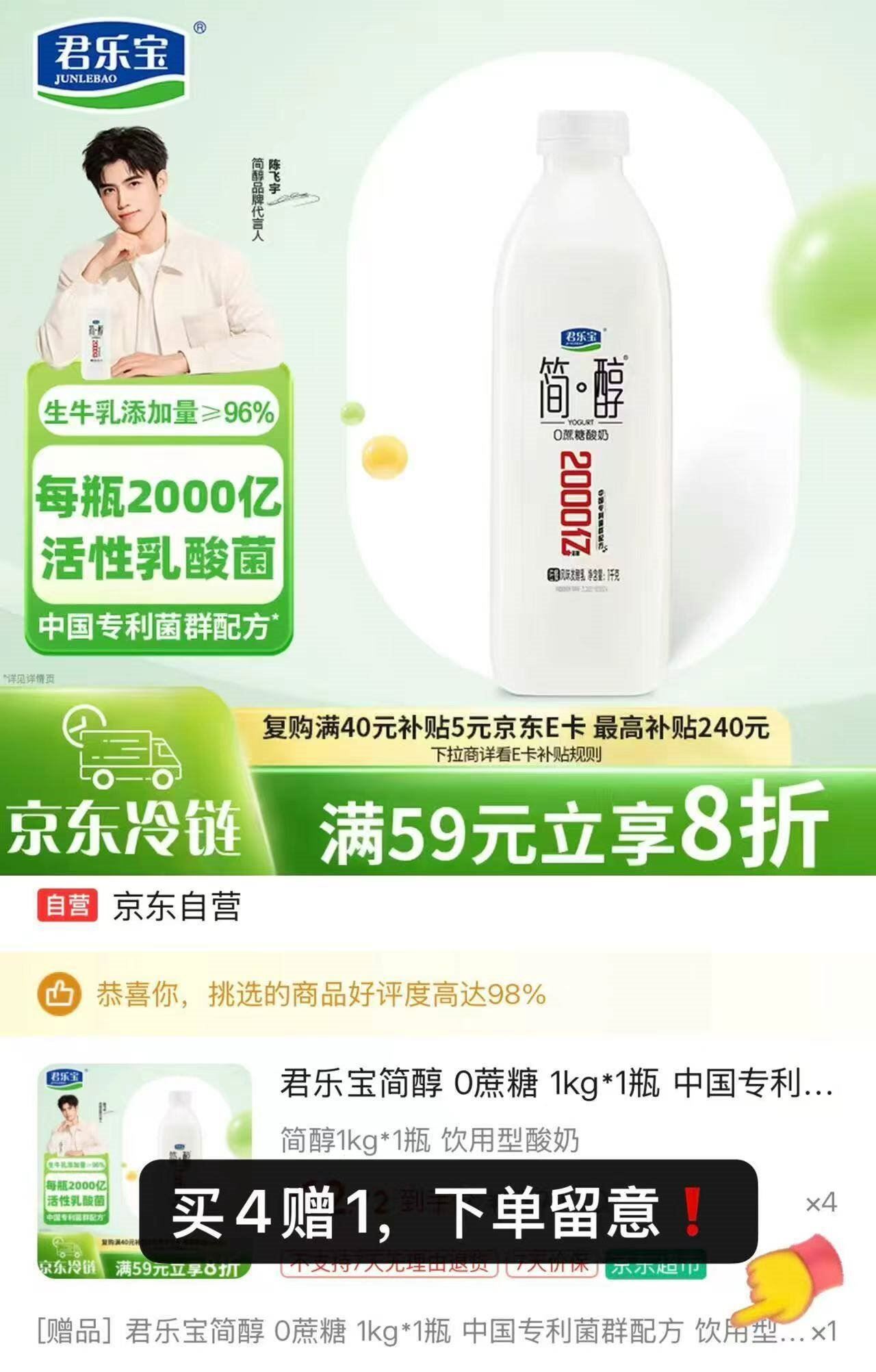 君乐宝简醇低温酸奶1000g 买4件50.8元 发报员Z 2026年04月08日 09:01 0 举报 ——君乐宝酸奶秒杀——【自营】简醇低温酸奶1000ghttps://u.jd.com/jrwZFYM 买4件50.8元 U,Plus包U*贈同歀1瓶 新客下単再减2元 复制文案