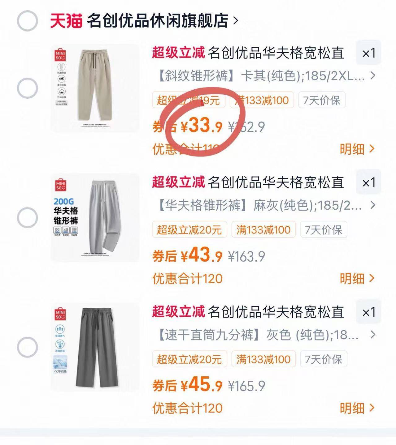 名创优品男休闲裤33.9元起
