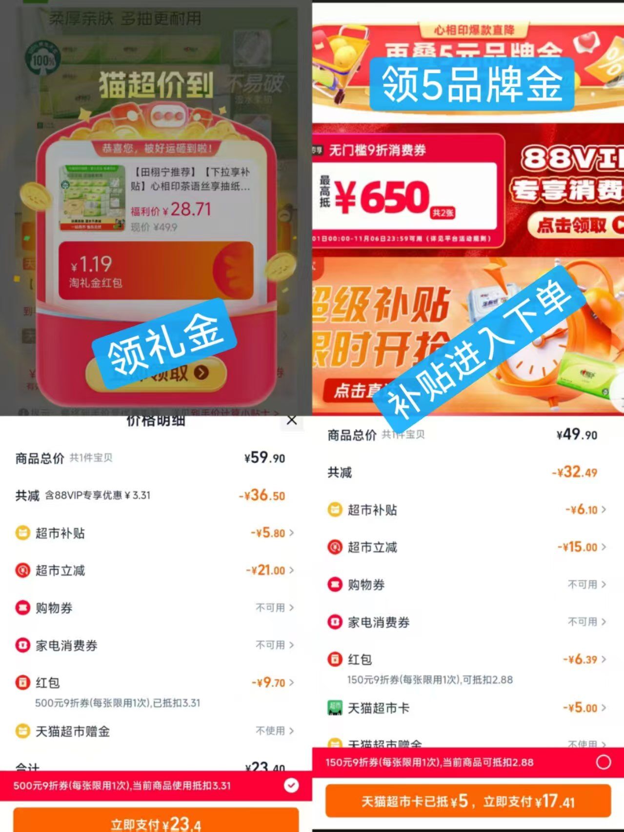 先领详情页5元品牌金,再下方超级补贴进入购买,折0.87一包