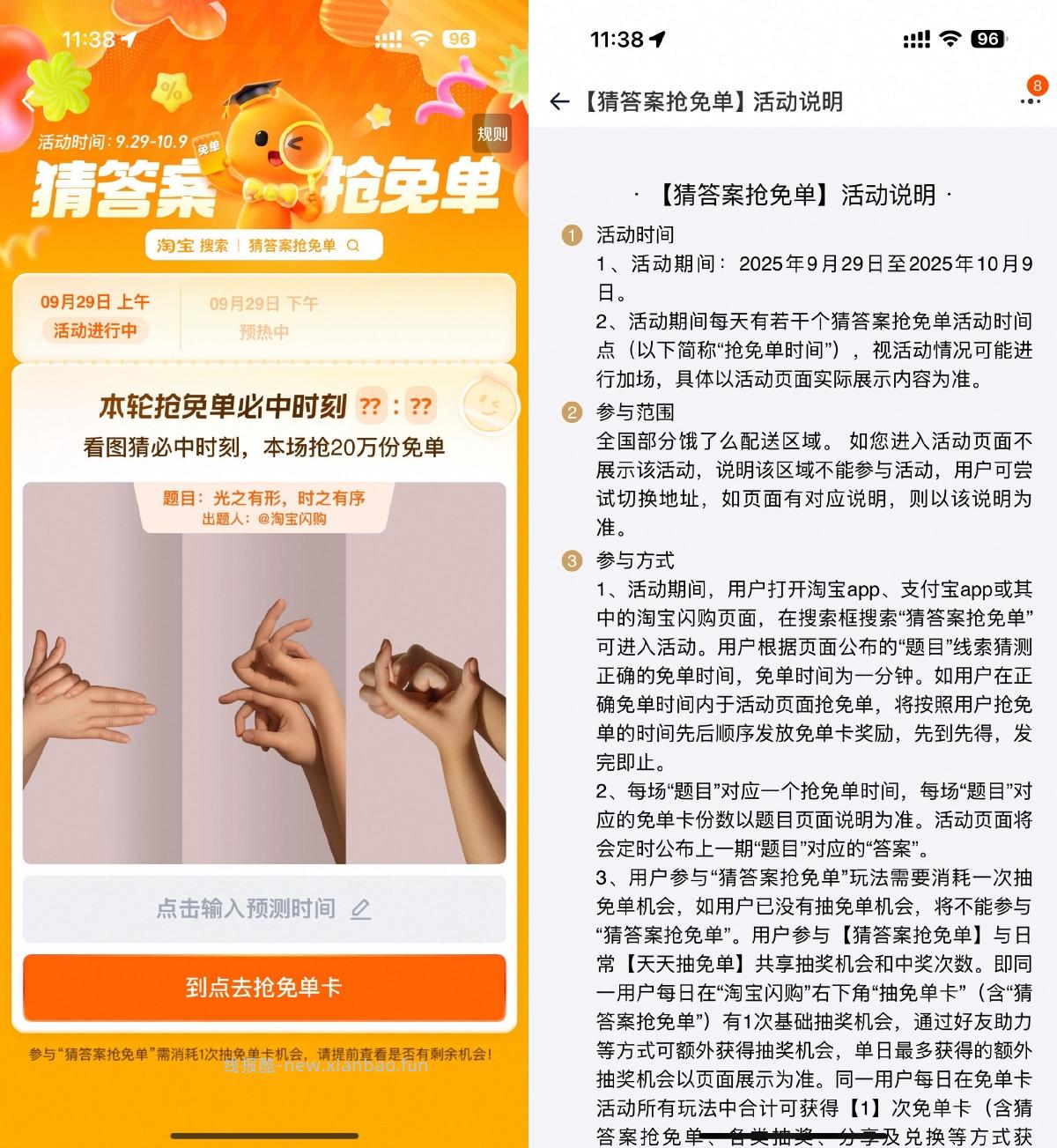 淘宝搜索“猜答案抢免单”->每天有2场活动,根据提示猜时间,准点即可抢20万张免单卡