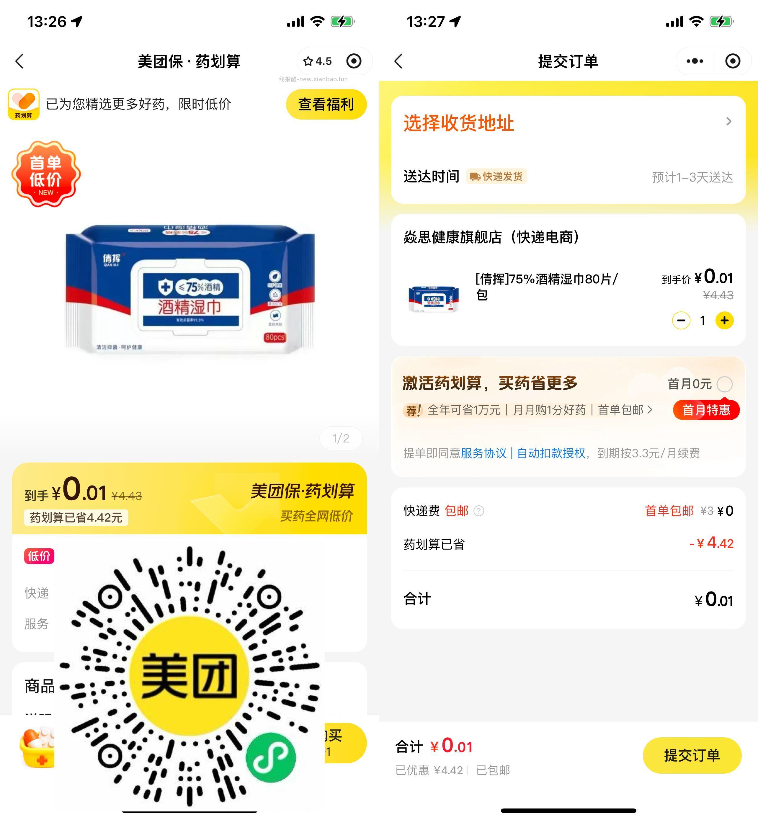 微信打开活动->直接0.01亓买酒精湿巾1包,大部分人都有首单包邮