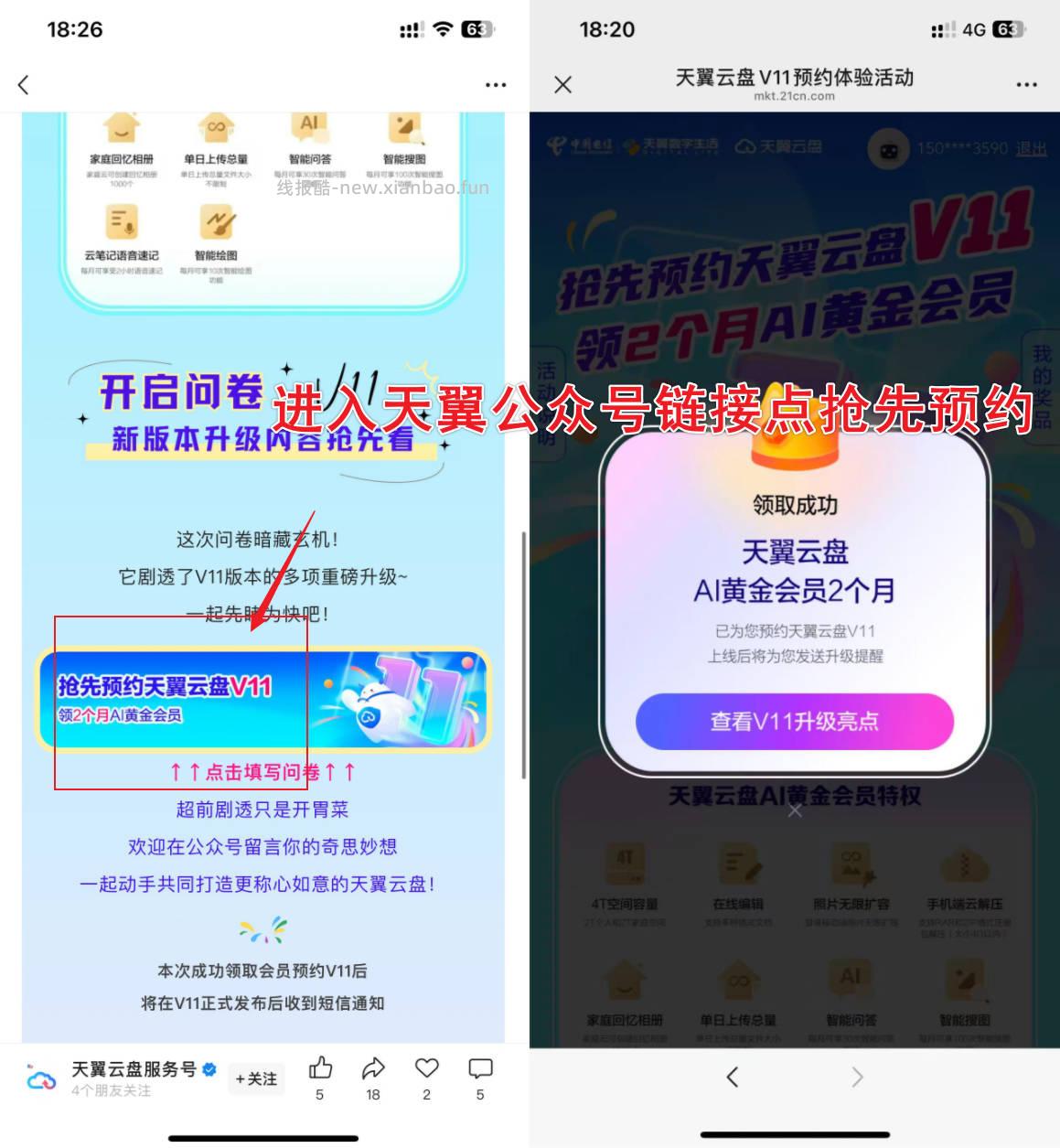 点击下面天翼公众号链接进入-登录-点击抢先预约天翼云盘v11进入-点击领取